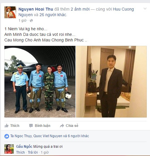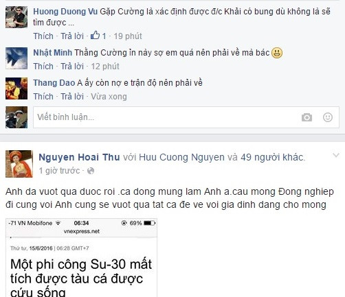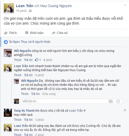 7h50: Trên Facebook cá nhân của phi công Cường, rất nhiều người thân và bạn bè của thiếu tá phi công đã chia sẻ cảm xúc vui mừng. Mong anh sớm được đưa về đất liền.