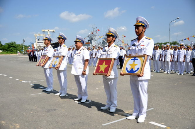 Quang cảnh buổi lễ thượng cờ hai tàu 379 và 380 sáng 24-9 - Ảnh: Đức Trong