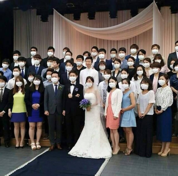 Hình ảnh đám cưới vô cùng ấn tượng và đáng nhớ khi ai nấy đều đeo khẩu trang phòng bệnh.