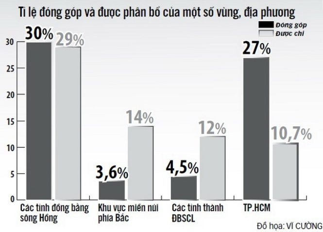 Theo tài liệu của Tuổi Trẻ, đang có sự mất cân đối về thu chi NSNN cho các vùng miền, địa phương (số liệu theo sơ đồ).
