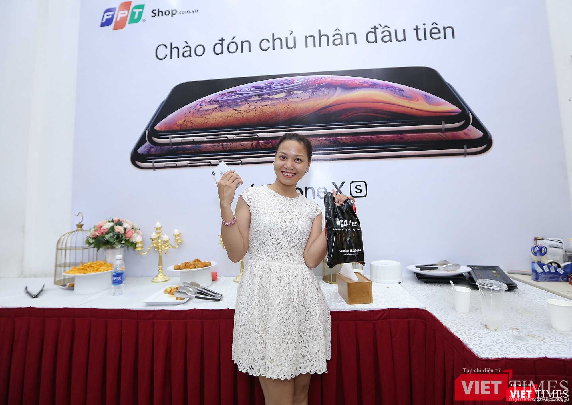 Đại diện FPT Shop phát biểu chào mừng. Sau 7 ngày chính thức nhận đặt cọc, đã có 5.000 đơn hàng được đặt thành công trên hệ thống của FPT Shop. Từ mùng 2 - 30/11, khi khách hàng chọn mua bất kỳ phiên bản nào thuộc bộ 3 iPhone XS, XS Max và XR sẽ nhận được một trong các ưu đãi: Thứ nhất, nếu chọn mua trả góp, khách hàng sẽ được tài trợ 100% lãi suất trong kỳ hạn 9 tháng, trong đó khách hàng chỉ cần trả trước từ 11.500.000 đồng và góp 1.346.000 đồng/tháng