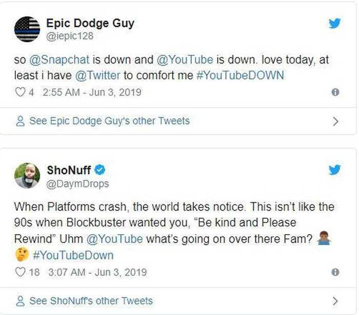 Người dùng đã lên Twitter để báo cáo rằng YouTube cũng đang gặp sự cố.