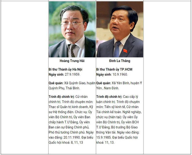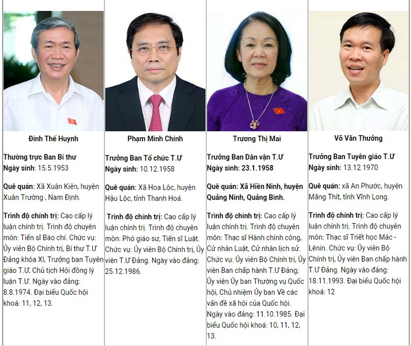 | Tổng bí thư Nguyễn Phú Trọng Ngày sinh:14.4.1944. Giới tính: Nam. Dân tộc: Kinh. Tôn giáo: Không. Quê quán:Xã Đông Hội, huyện Đông Anh, TP.Hà Nội. Trình độ chính trị: Cao cấp lý luận chính trị. Trình độ chuyên môn:Cử nhân Văn, Giáo sư, Tiến sĩ Chính trị học (Chuyên ngành xây dựng Đảng). Tổng bí thư Ban chấp hành T.Ư Đảng khóa XI, XII, Bí thư Quân ủy T.Ư. Ngày vào đảng: 19.12.1967. Đại biểu Quốc hội khoá: 11, 12, 13. |