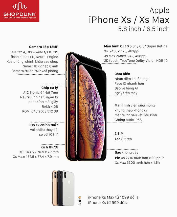 Bạn có thể tham khảo ảnh so sánh thông số kĩ thuật và giá cả giữa iPhone Xs và Xs Max trước khi quyết định mua vào ngày 21/9 tới tại Apple Store: