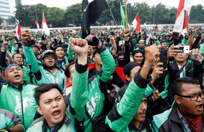 Hãng tin Reuters đưa tin, khoảng 1.500 tài xế mặc áo đồng phục và mũ bảo hiểm của hai dịch vụ taxi công nghệ Grab và Go-Jek đã biểu tình trước tòa nhà quốc hội tại thủ đô Jakarta, Indonesia. Đám đông mong muốn các nhà chức tránh sớm có biện pháp cải thiện giá hoạt động, bảo vệ đời sống cho những người hoạt động vận tải.