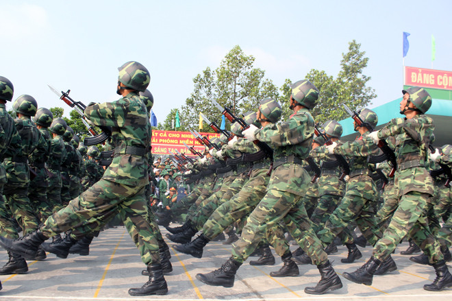 Ngày 20/4, ngay từ sáng sớm, hàng nghìn cán bộ, chiến sĩ đã có mặt tại Trường quân sự Quân khu 7 để hợp luyện diễu binh, diễu hành cho lễ 30/4.