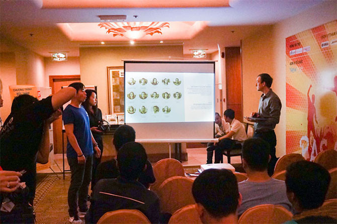 Antonio Meze (ngoài cùng bên phải), người sáng lập Meze Audio giới thiệu về thương hiệu này tại triển lãm.