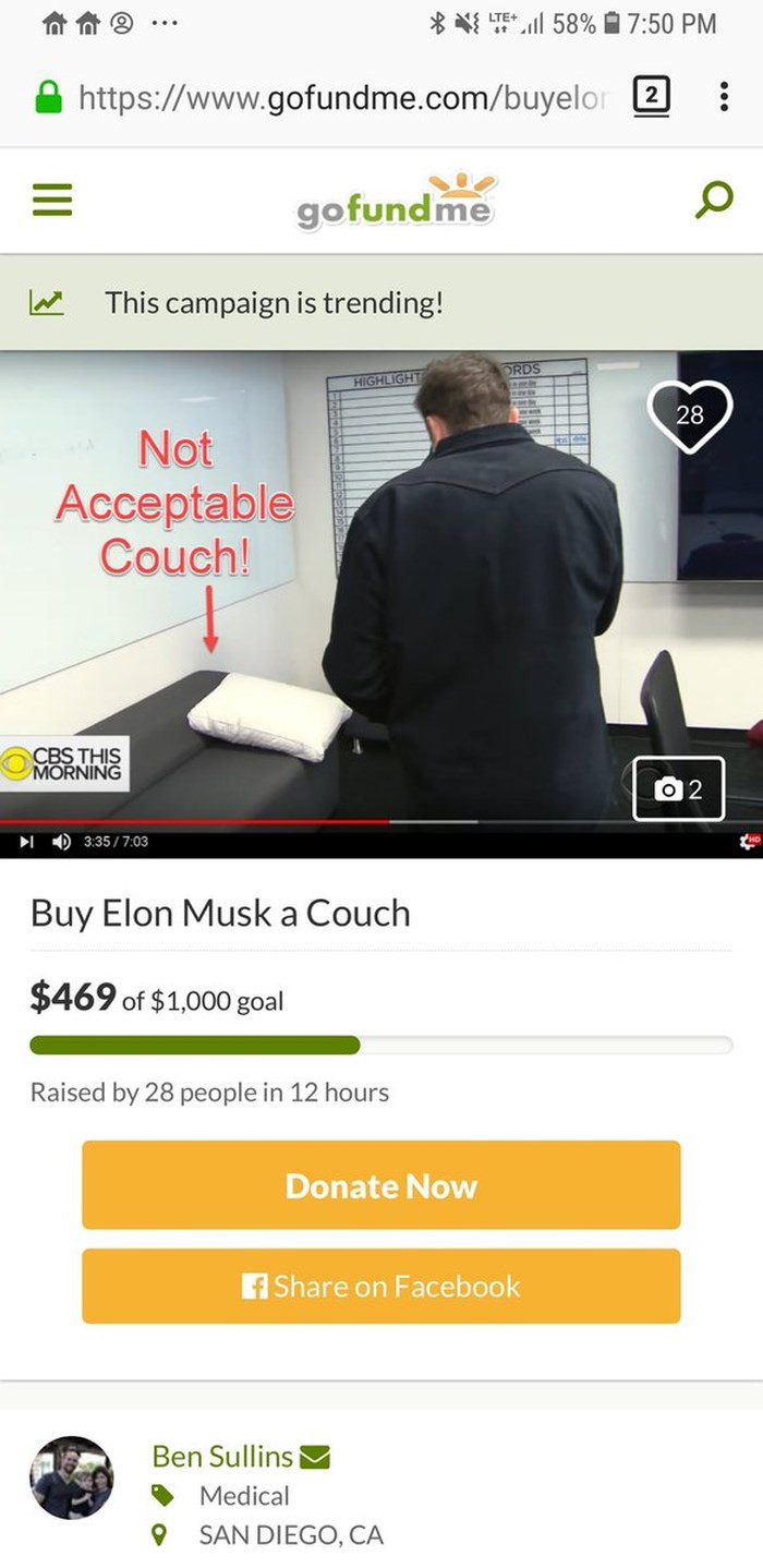 Cuộc gây quỹ thú vị này diễn ra khi một người ủng hộ Elon Musk - vì quá đau lòng trước hoàn cảnh khốn khổ của ông - đã lập ra một chiến dịch gây quỹ trên website GoFundMe để giúp ông mua một chiếc sofa mới. Anh chàng này tên là Ben Sullins, và anh đã nói rằng: "Là một cộng đồng, chúng ta không thể để điều này xảy ra. Hãy cùng tập hợp lại để mua tặng Elon một chiếc trường kỷ mới làm chỗ ngủ!".