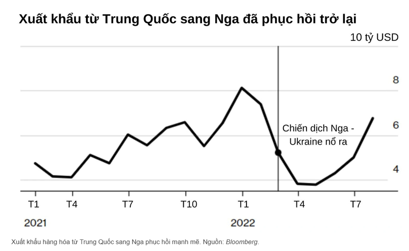 Tháng trước, Nga đã nhập khẩu gần 6,7 tỷ USD hàng hóa Trung Quốc, tăng hơn 20% so với năm ngoái. Hãng thông tấn Tass hôm 17/8 đã dẫn lời một quan chức Nga dự báo rằng thương mại song phương giữa hai nước có thể tăng hơn 30% lên 190 tỷ USD trong năm nay.