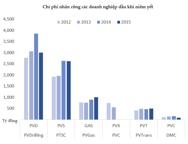 Nhìn chung tổng chi phí nhân công của 5 công ty dầu khí lớn đang niêm yết trên sàn giảm 10% trong năm 2015, do tác động của PV Drilling.