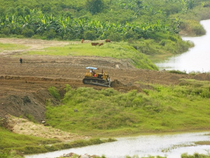 Hình ảnh ngày 18/8, một máy xúc đang san gạt đất ra khu vực dòng sông Hồng.