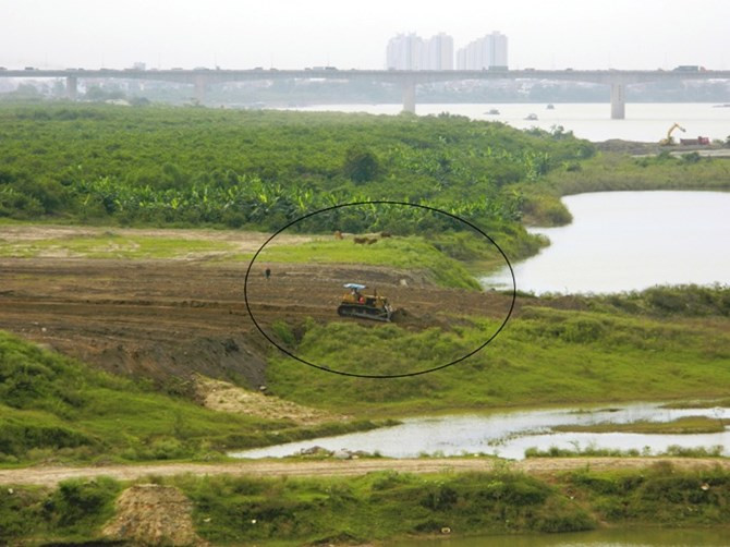 So với bức ảnh trên, khu vực khoanh tròn đã không còn cỏ xanh nữa mà đã được tôn cao hơn. Lãnh đạo phường Long Biên phủ nhận thông tin có máy xúc tiếp tục san, gạt lấp hành lang thoát lũ sông Hồng.