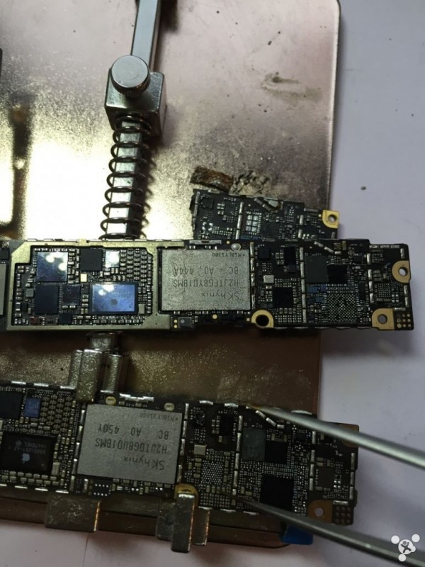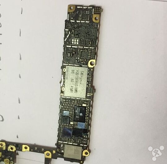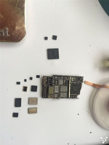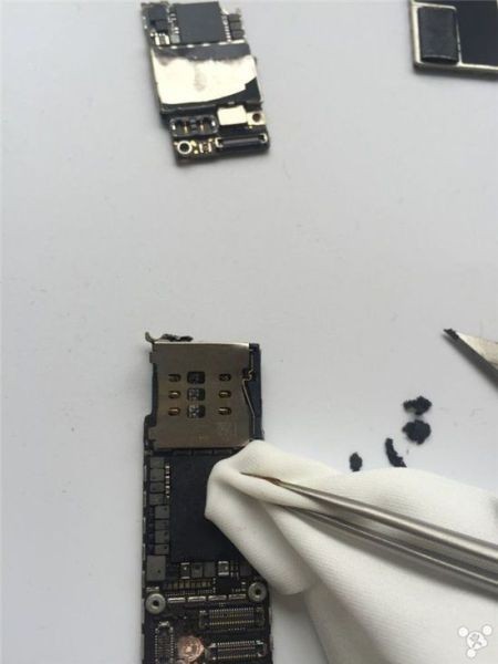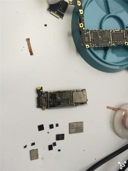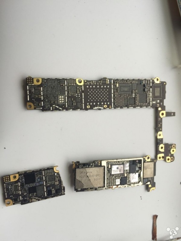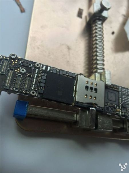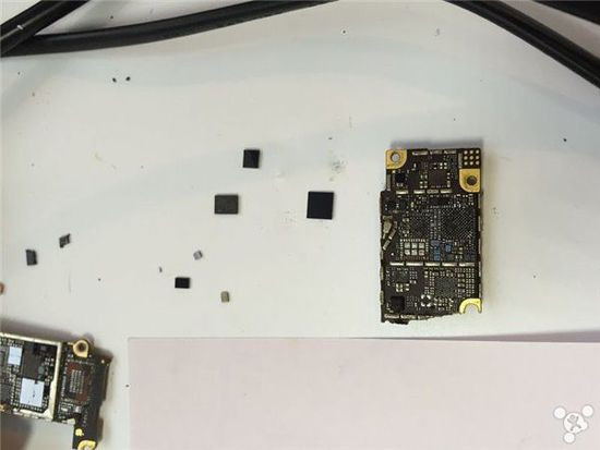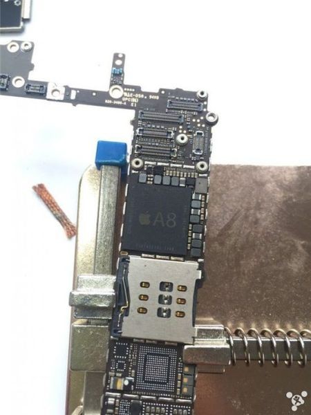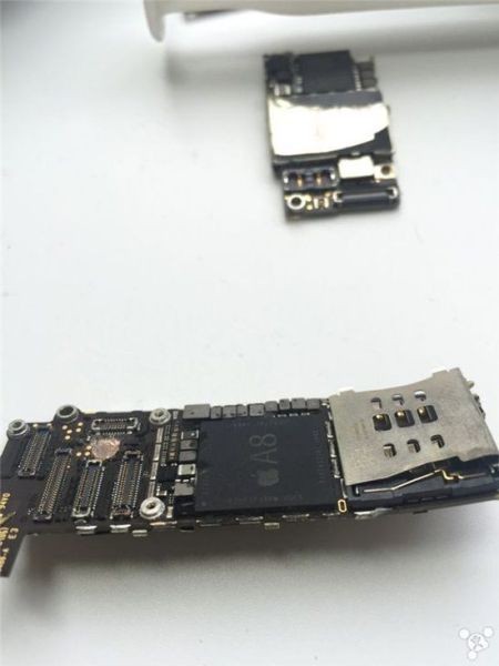 Tháo phần bo mạch chủ, bên trong có vi xử lý Apple A8. Quan sát kĩ, phần dây điện đã bị đứt, một số linh kiện đã gần như bung bét hết cả.