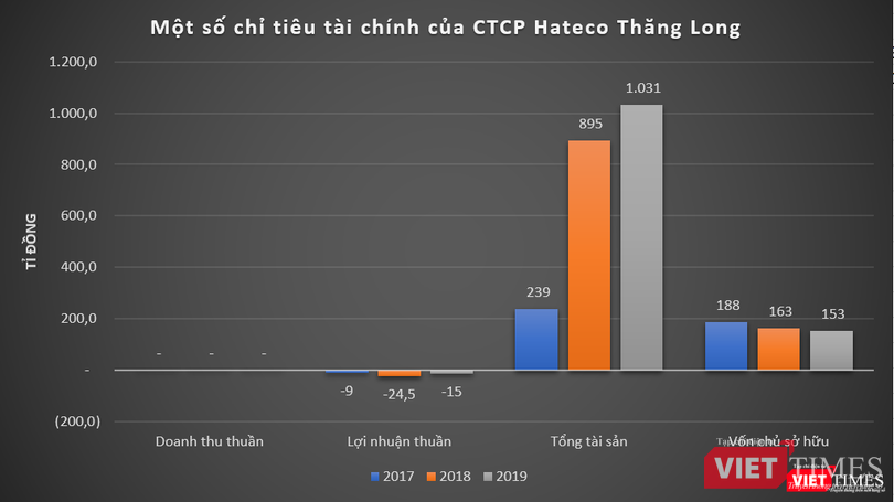 Dữ liệu của VietTimes cho thấy, các năm gần đây, Hateco Thăng Long không phát sinh doanh thu do vẫn trong quá trình phát triển dự án. Giai đoạn 2017 – 2019, công ty này báo lỗ thuần lần lượt 9 tỉ đồng, 24,5 tỉ đồng và 15 tỉ đồng.