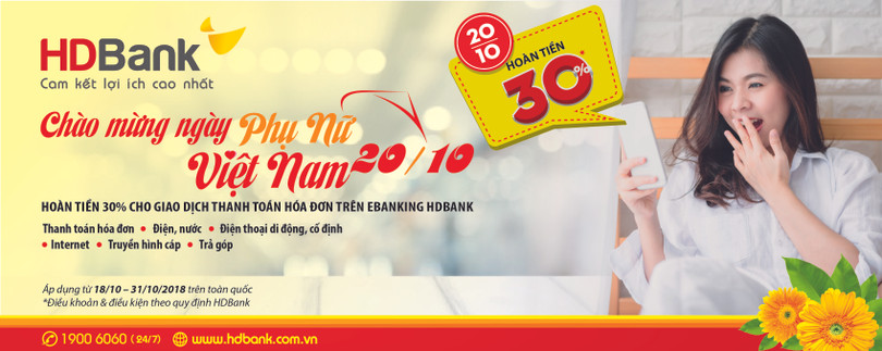 HDBank cho biết chương trình ưu đãi này nhằm hướng đến việc tôn vinh phái đẹp nhân Ngày Phụ nữ Việt Nam 20/10 và tri ân các khách hàng đang sử dụng dịch vụ ngân hàng điện tử của ngân hàng.