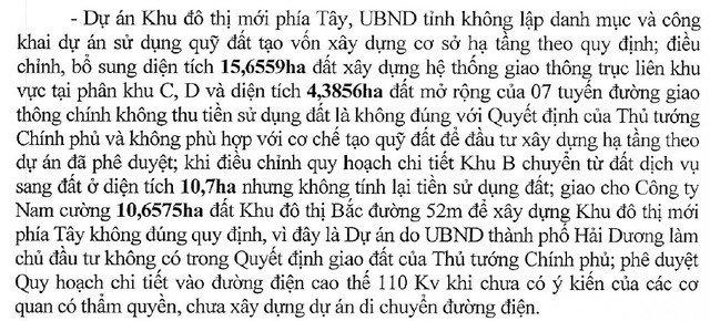 Trong đó, đáng chú ý trong kết luận này là nội dung, UBND tỉnh Hải Dương tự ý chuyển đổi 10,7ha từ đất dịch vụ sinh thái sang đất ở cho Tập đoàn Nam Cường nhưng không thu tiền sử dụng đất theo quy định.