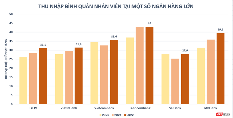 Theo thống kê của VietTimes, trong năm 2022, thu nhập bình quân của nhân viên ở phần lớn các ngân hàng đều ghi nhận tăng so với năm trước từ 5,7 – 10,3%.