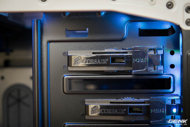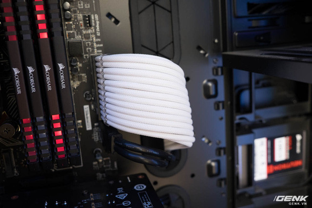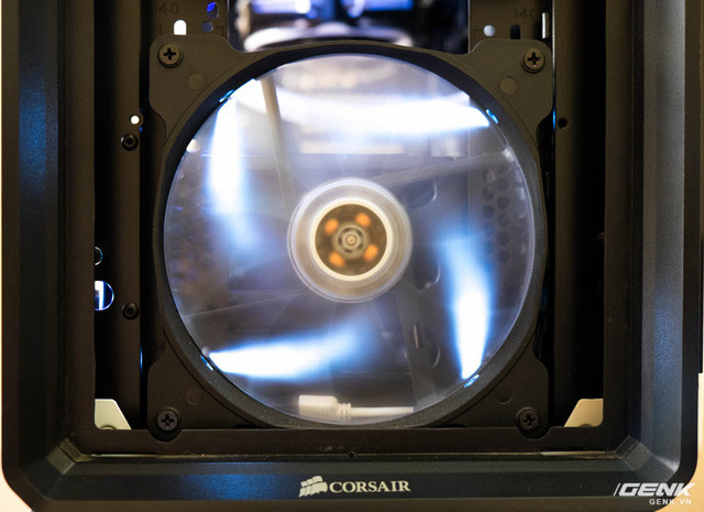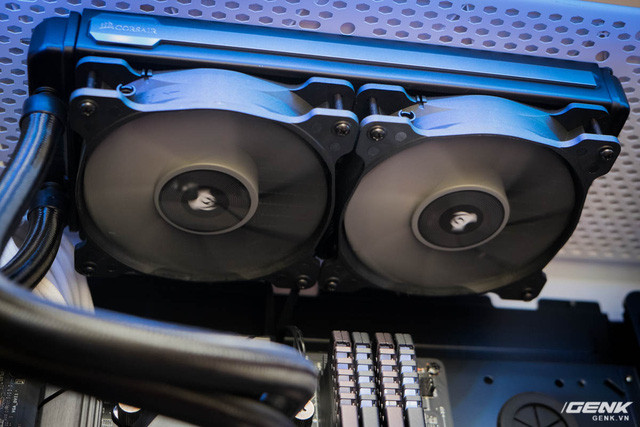 Corsair 760T cho phép lắp tới 2 quạt 140mm ở mặt trước, 1 quạt 140mm ở mặt sau và hỗ trợ radiator 360mm ở mặt phía trên, quá đủ cho các hệ thống custom watercooling lớn nhỏ. Tuy nhiên, hướng tới sự đơn giản, chủ nhân dàn máy lại chọn H110, tản nước AiO khá đơn giản của Corsair.