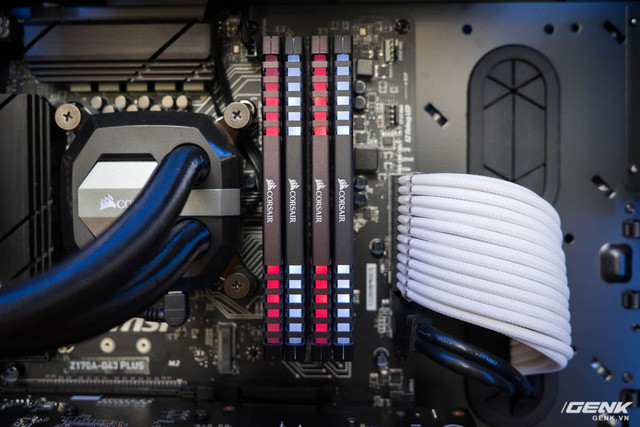 Ngoài ra, dàn máy còn sở hữu sức mạnh từ combo Intel Skylake bao gồm Mainboard MSI Z170-G43 và CPU Intel Core i7-6700. Nhiều chi tiết trên mainboard này mang tông màu trắng, rất phù hợp với ý tưởng của bộ case. Sau cùng là VGA MSI GTX 1060 Armor 6G OCV1.