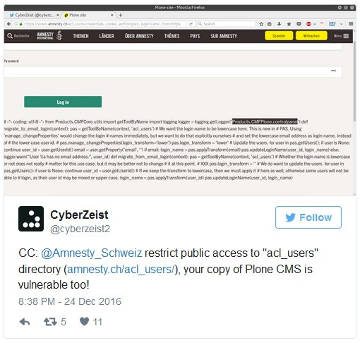 CyberZeist cảnh báo rằng, các cơ quan tổ chức, hiện đang sử dụng Plone CMS cũng rất dễ bị tấn công tương tự, trong đó có cả các cơ quan như Tổ chức EU về Mạng & Bảo mật thông tin, Trung tâm điều phối Quyền Sở hữu Trí tuệ (Intellectual Property Rights Coordination Center - WIPO) và Tổ chức Ân xá Quốc tế.