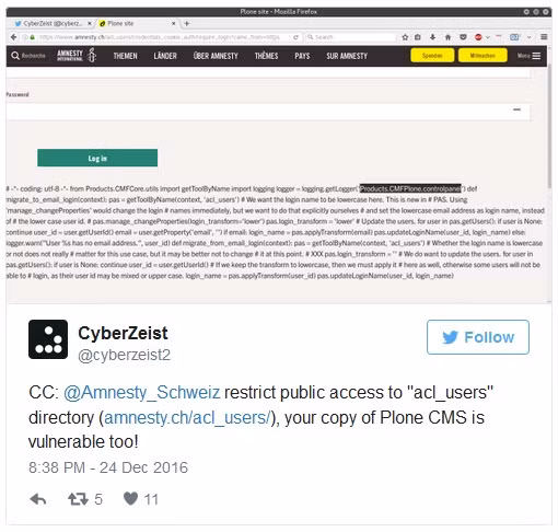 CyberZeist đã tìm thấy một lỗ hổng zero - day trong Plone CMS, được các chuyên gia an ninh mạng đánh giá là Hệ thống quản trị nội dung (CMS) an toàn nhất trong số các chuyên gia an ninh. CMS này được sử dụng cho nhiều trang web lớn như Google, FBI và CIA, các cơ quan quan trọng khác của Mỹ.