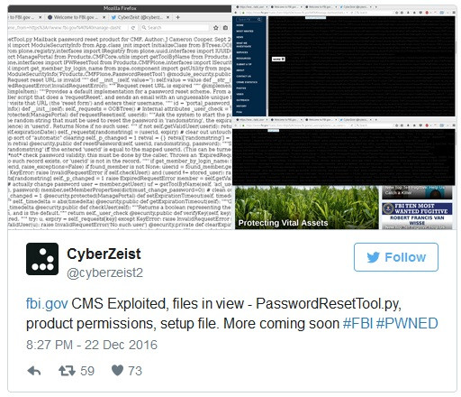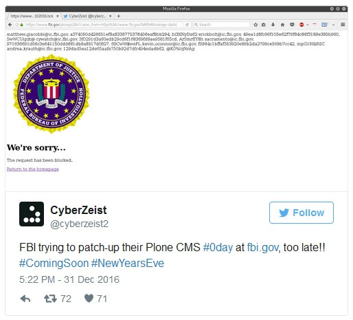 Ngày 22.12 .2016, CyberZeist, còn được gọi với mật danh là Le4ky, khai thác một lỗ hổng zero-day trong Hệ thống quản trị nội dung Plone (CMS) của trang web của FBI, đăng tải một số thông tin bị rò rỉ lên trang Pastebin, một trang web mã nguồn mở thường được tin tặc sử dụng để đăng tải thông tin bị đánh cắp và các đoạn code.