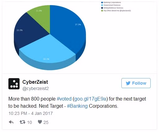 Trong các hoạt động tiếp theo của mình, CyberZeist công bố một cuộc bình chọn, đặt câu hỏi, những người hâm mộ bỏ phiếu cho mục tiêu tiếp theo mà hacker này nên tấn công. Những mục tiêu được đưa ra bình chọn là Các cơ quan chính phủ, các tập đoàn ngân hàng, website cơ quan quân sự và các cơ quan quốc phòng quốc gia (vệ binh quốc gia) và nhiều tùy chọn "khác", người dùng có thể tweet sở thích của mình để CyberZeist lựa chọn. Lựa chọn phổ biến là các tổ chức ngân hàng với hơn 800 phiếu bầu cho đến thời điểm này.