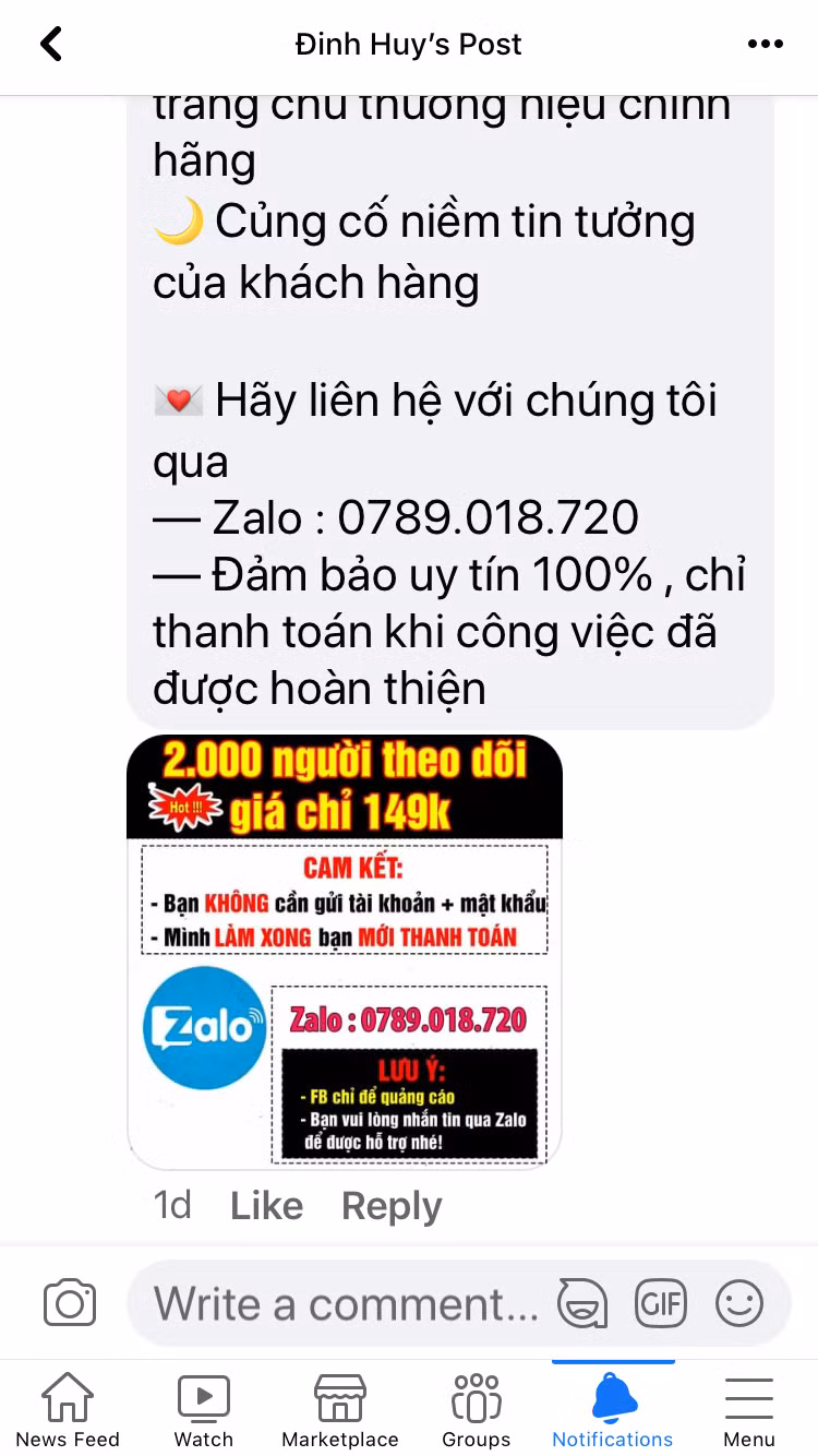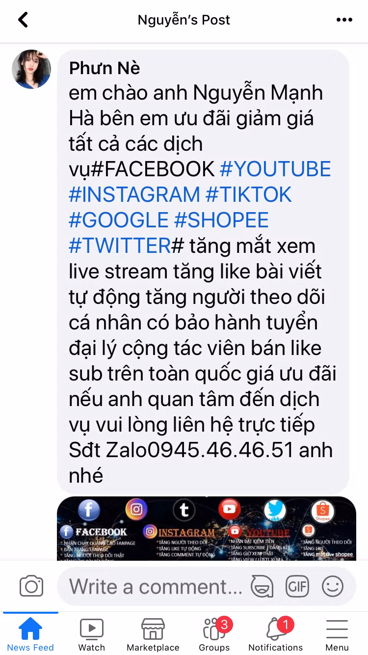 | Nhiều công ty truyền thông đã có hẳn một chiến lược kinh doanh ăn theo xu hướng này với những tin nhắn gửi đến cho những cá nhân trên mạng xã hội, thả quảng cáo vào "nhà" các Facebooker có đông người theo dõi, công khai mời chào mua bài, mua Facebook có tick xanh… |