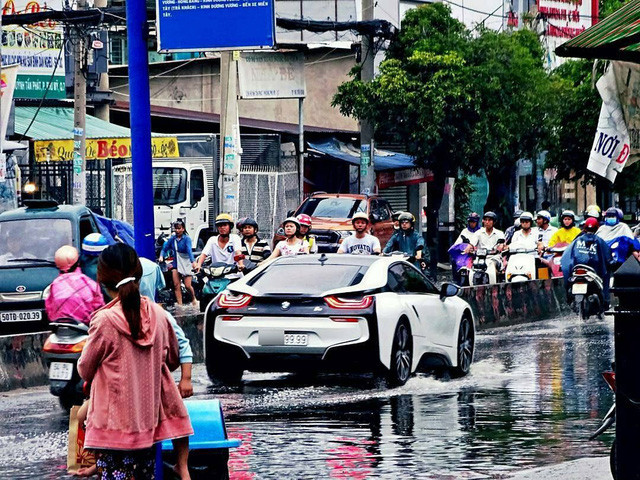 Chiếc BMW i8 lội nước trên một con đường của Sài Gòn sau cơn mưa. Ảnh: Thinhbmwi8