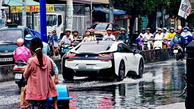 Trong hình ảnh, có thể thấy chiếc BMW i8 chạy trên con đường bị ngập nước sau cơn mưa tại Sài Gòn. Tuy nhiên, vì nước ngập không quá cao nên chiếc BMW i8 cũng chẳng gặp nhiều khó khăn khi di chuyển trên con đường này.