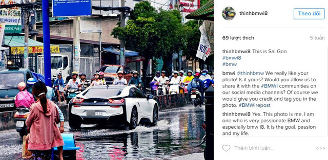 Cách đây không lâu, tài khoản Instagram của hãng BMW đã đăng hình ảnh một chiếc i8 màu trắng muốt và đeo biển kiểm soát "tứ quý 9" cực đẹp của Hà Nội chạy trên đường phố Sài Gòn. "BMW i8 luôn đảm bảo mang đến những trải nghiệm đáng nhớ dù bạn trực tiếp cầm lái hay nhìn thấy xe trên đường" là dòng chú thích đi kèm với bức ảnh được đăng lên tài khoản Instagram của hãng BMW.