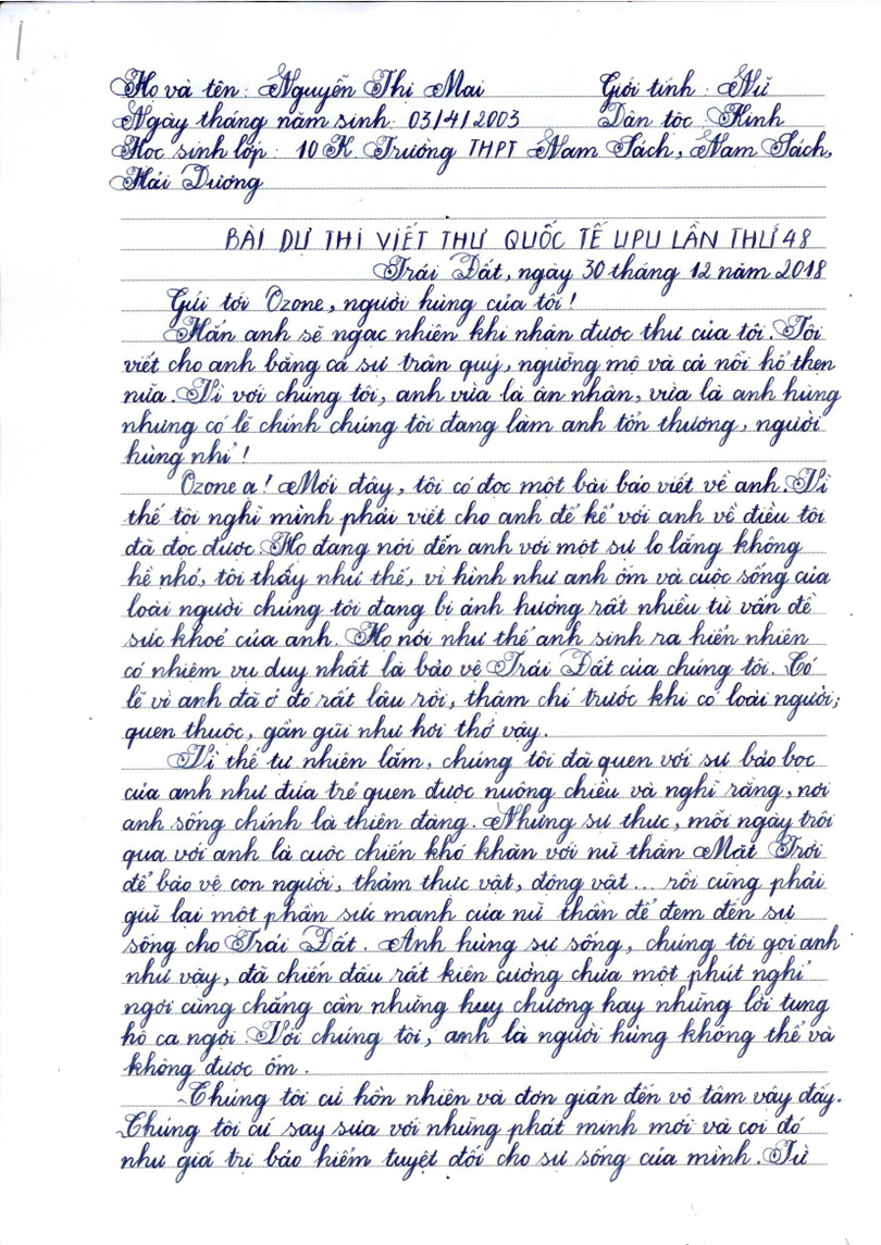 Toàn văn bức thư UPU đoạt giải Nhất của em Nguyễn Thị Mai, lớp 10K, Trường Trung học phổ thông Nam Sách (Hải Dương):