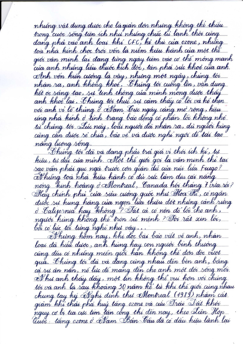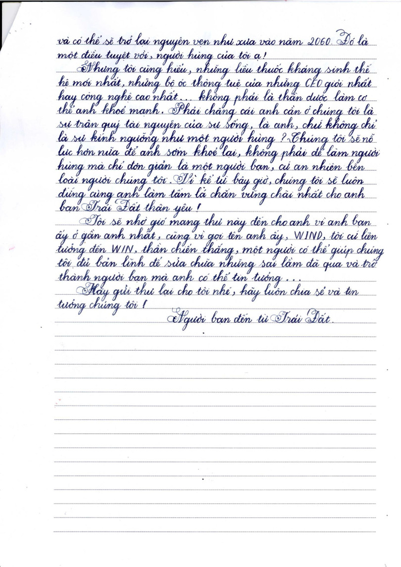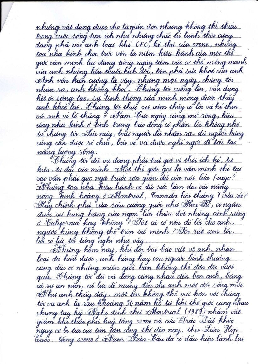 Giành giải Nhất năm nay là bức thư về đề tài môi trường, rất sáng tạo và độc đáo trong cách đặt vấn đề và giải quyết vấn đề, cách trình bày lôgic, chặt chẽ, thông điệp ý nghĩa. Chủ nhân của bức thư gây bất ngờ cho người đọc khi em viết về người hùng của mình là tầng Ozon. Ozon khổng lồ và mạnh mẽ, Ozon bao bọc và bảo vệ con người trong vòng tay đầy khoan dung, trong khi con người không ngừng làm tổn thương người hùng sự sống của mình. Người hùng ấy đang bị ốm, đang cần được con người chăm sóc, bảo vệ và giữ gìn. Bức thư đã nhận được sự đồng thuận cao của các thành viên Ban Giám khảo.