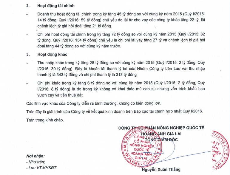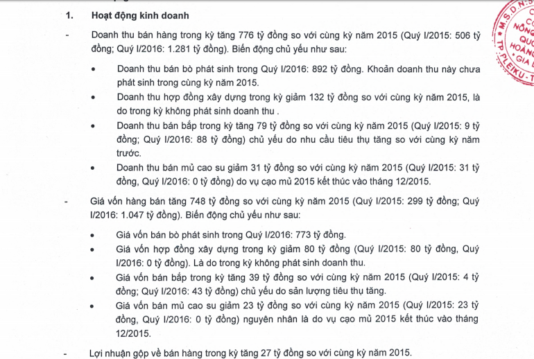 Đáng chú ý, bản giải trình tiết lộ một thông tin khá thú vị, rằng HNG đã “thanh lý bò của Nhóm Công ty bên Lào” với thu nhập thanh lý là 343 tỷ đồng và chi phí thanh lý là 313 tỷ đồng. Cũng chính hoạt động này đã làm cho thu nhập khác của HNG trong Quý I/2016 tăng 28 tỷ đồng so với cùng kỳ năm 2015 (Quý I/2015: 2 tỷ đồng, Quý I/2016: 30 tỷ đồng).