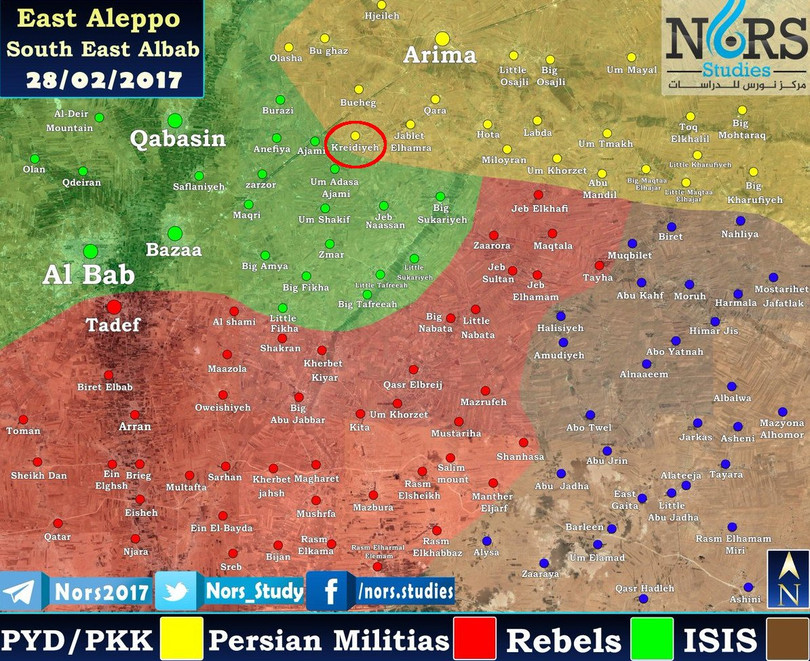 Ngày 27.02.2017, quân đội Syria ào ạt tấn công giải phóng liên tiếp các ngôi làng ngoại vi Al-Bab, tiến sát đến chiến tuyến của lực lượng dân quân người Kurd YPG cắt đường của lực lượng liên quân các tổ chức thánh chiến do Quân đội Syria tự do là chủ lực với sự hỗ trợ của quân đội Thổ Nhĩ Kỳ đến vùng nông thôn phía đông nam thành phố Aleppo.