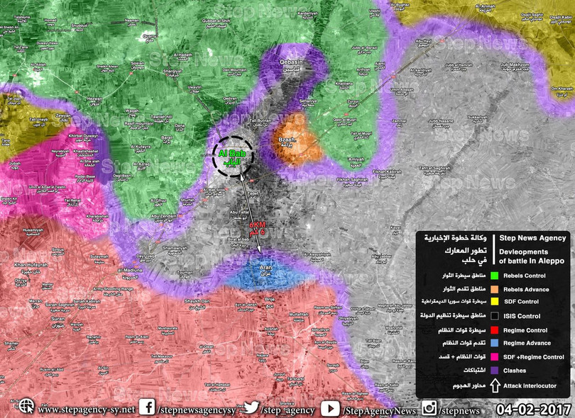 Cùng thời gian này, quân đội Syria và Lực lượng vũ trang địa phương (Phòng vệ Quốc gia - NDF) giải phóng làng Um Arkelah, phía nam căn cứ không quân Kuweires. Ngày 04.02.2017, lực lượng Tiger giải phóng thị trấn chiến lược Aran, phía nam thành phố al-Bab.