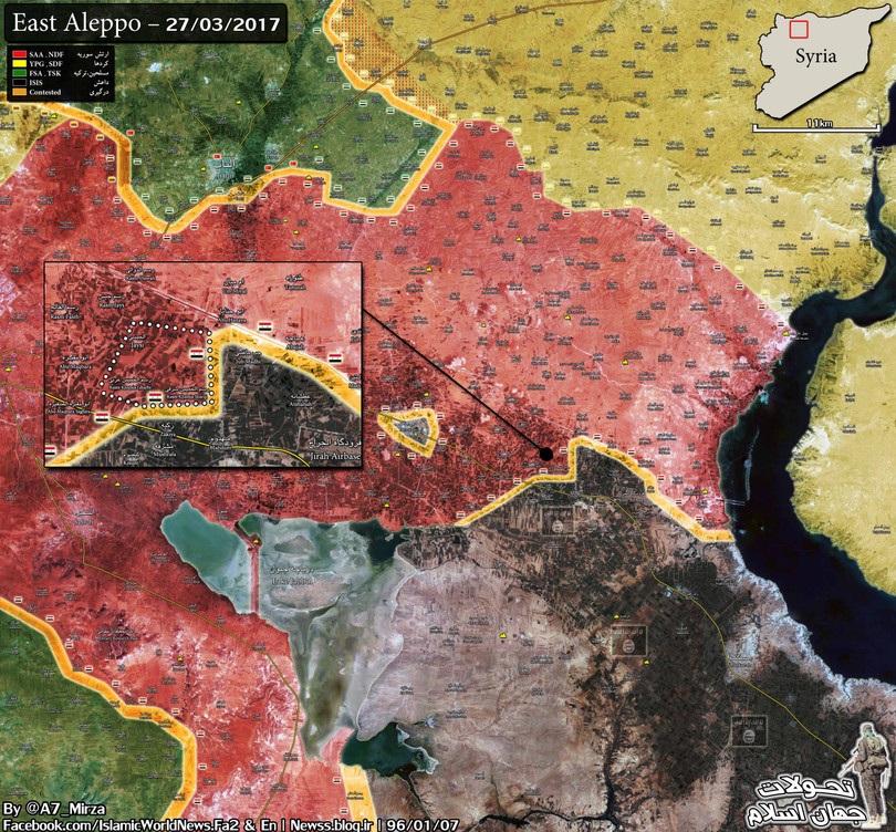 Sáng sớm ngày 28.03.2017, các đơn vị quân đội Syria, chủ công là lực lượng đặc biệt tinh nhuệ Tiger đánh mạnh theo hướng căn cứ không quân Jirah, giải phóng ngôi làng tiếp theo Rasm Al-Khamis Ash-Sharqi.