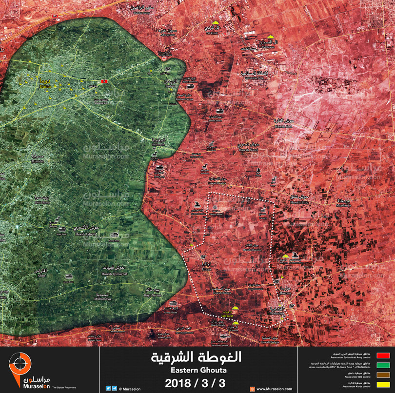 Ibrahim Joudeh, phóng viên chiến trường Al-Masdar News cho rằng, quân đội Syria đã giành được từ 80 đến 90 % diện tích thị trấn. Có nhiều khả năng các đơn vị vũ trang Syria sẽ giành được thị trấn này trong ngày 04.03.2018.