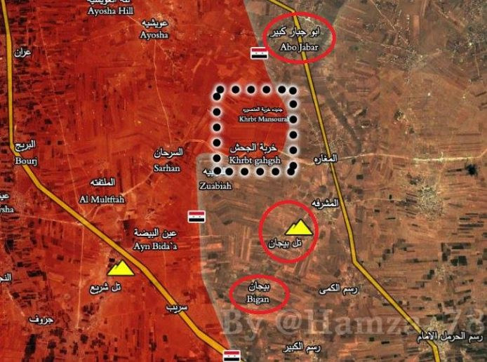 Hướng tấn công chiến lược mới của quân đội Syria về phía đông được khẳng định bằng một cuộc pháo kích dữ dội phối hợp với các cuộc không kích liên tục đánh vào các làng Abou Jabbar, Bejan và Al-Mazbourah trong vùng tạm chiếm của IS (vòng tròn trong bản đồ số 1).