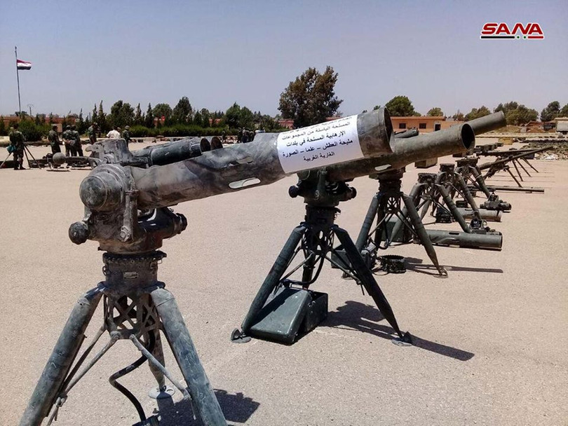 | Một số vũ khí trang bị điển hình của lực lượng Hồi giáo cực đoan bị quân đội Syria thu giữ ở vùng đông bắc Daraa. Ảnh SANA |