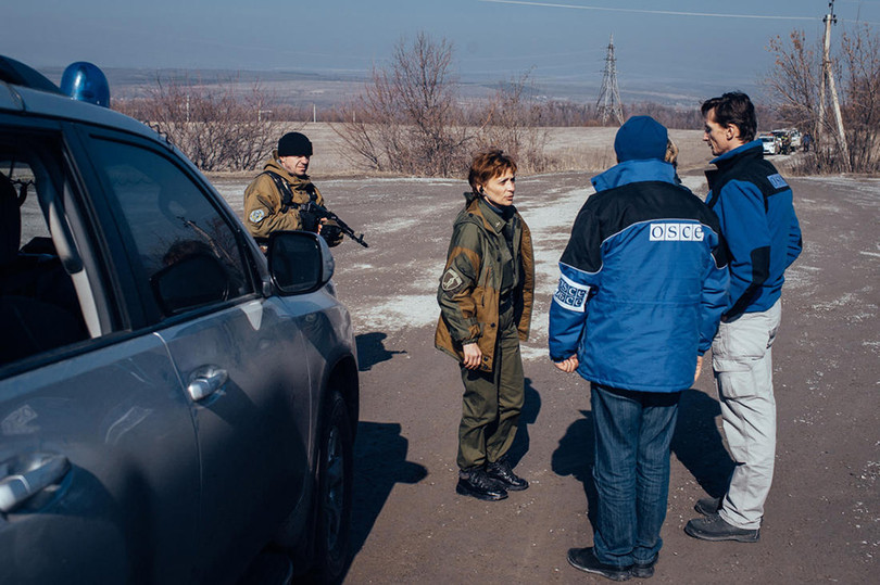 Trung đoàn trưởng trung đoàn tên lửa ,Trung tá Olga "Corsa" Katchura và các đại diện OSCE.