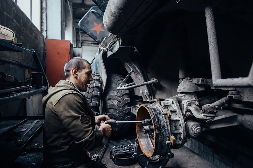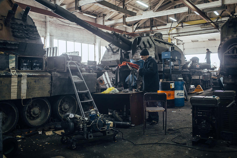 Khu xưởng sủa chữa của tiểu đoan "Vostok" vùng ngoại ô Donetsk. Trong ảnh - pháo tự hành 2S19 "Msta-S" 152 mm, chiến lợi phẩm ở Starobeshevo.