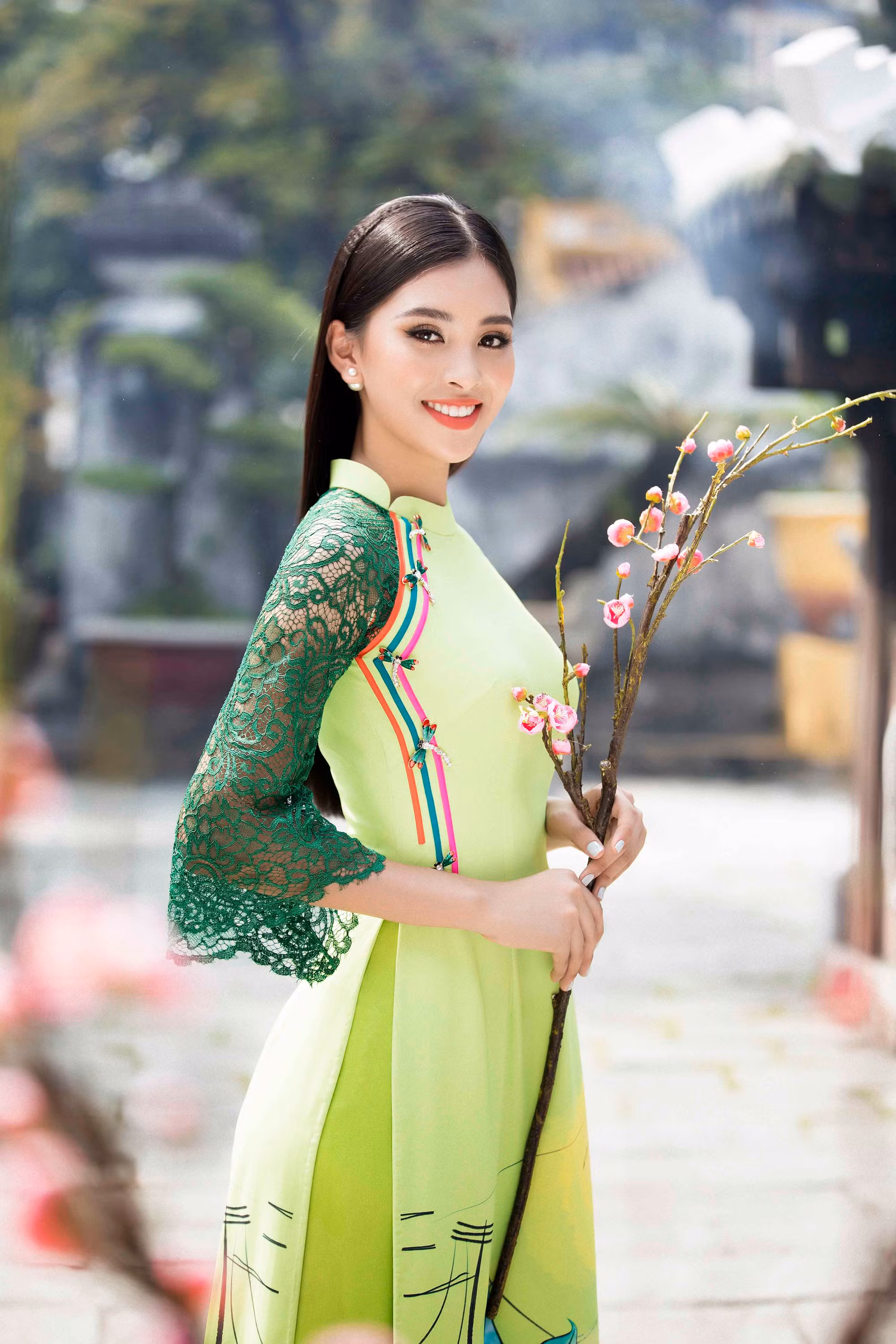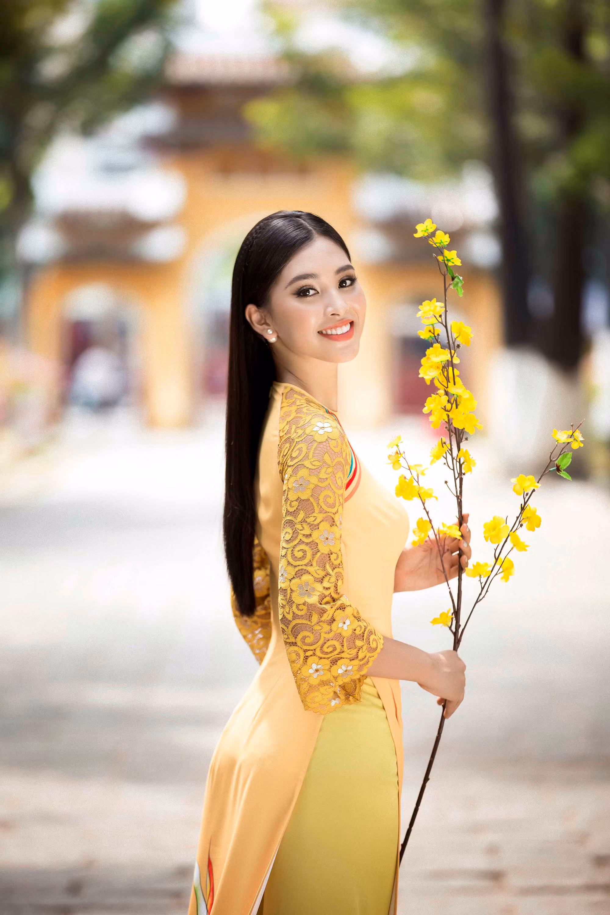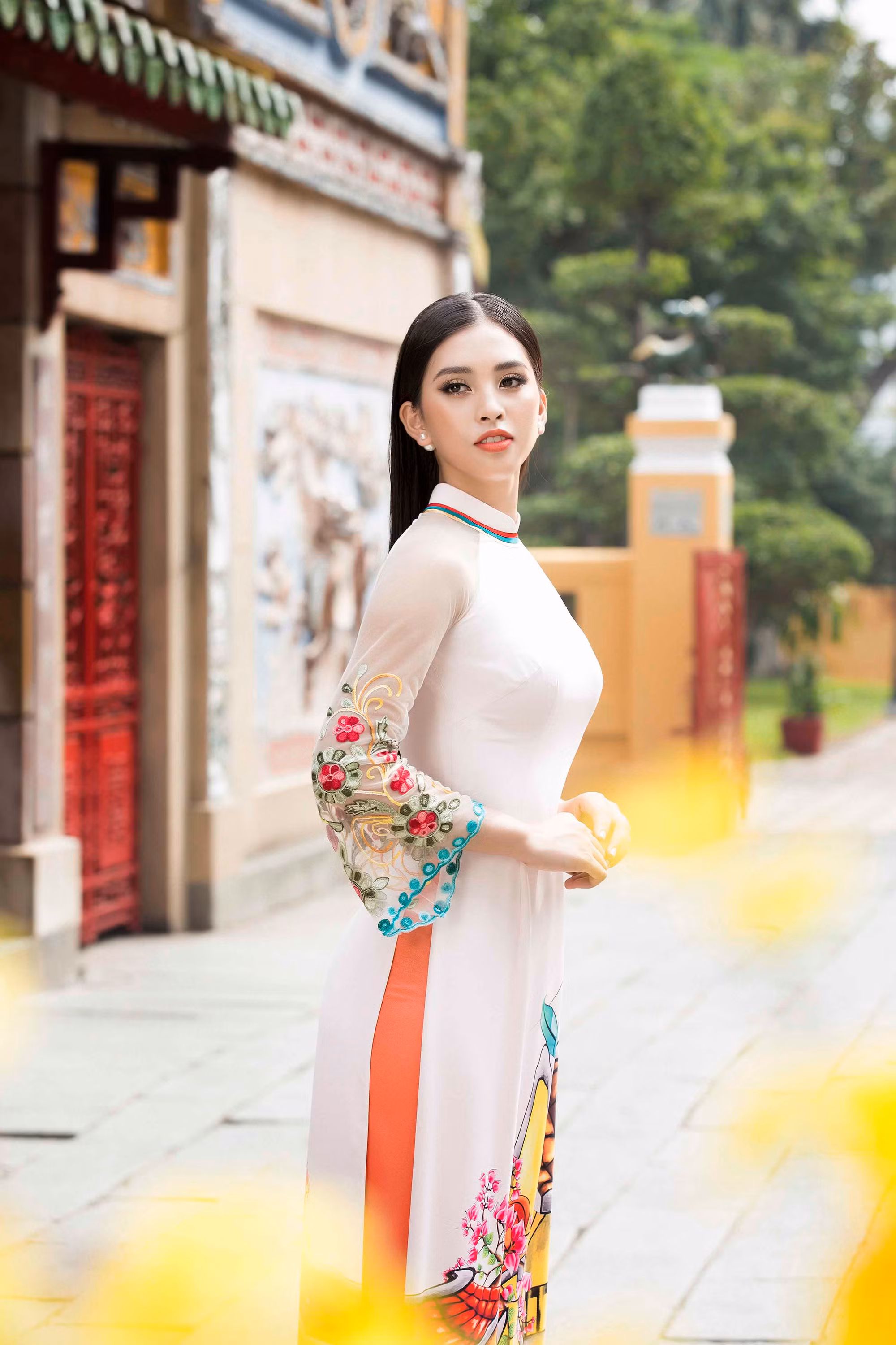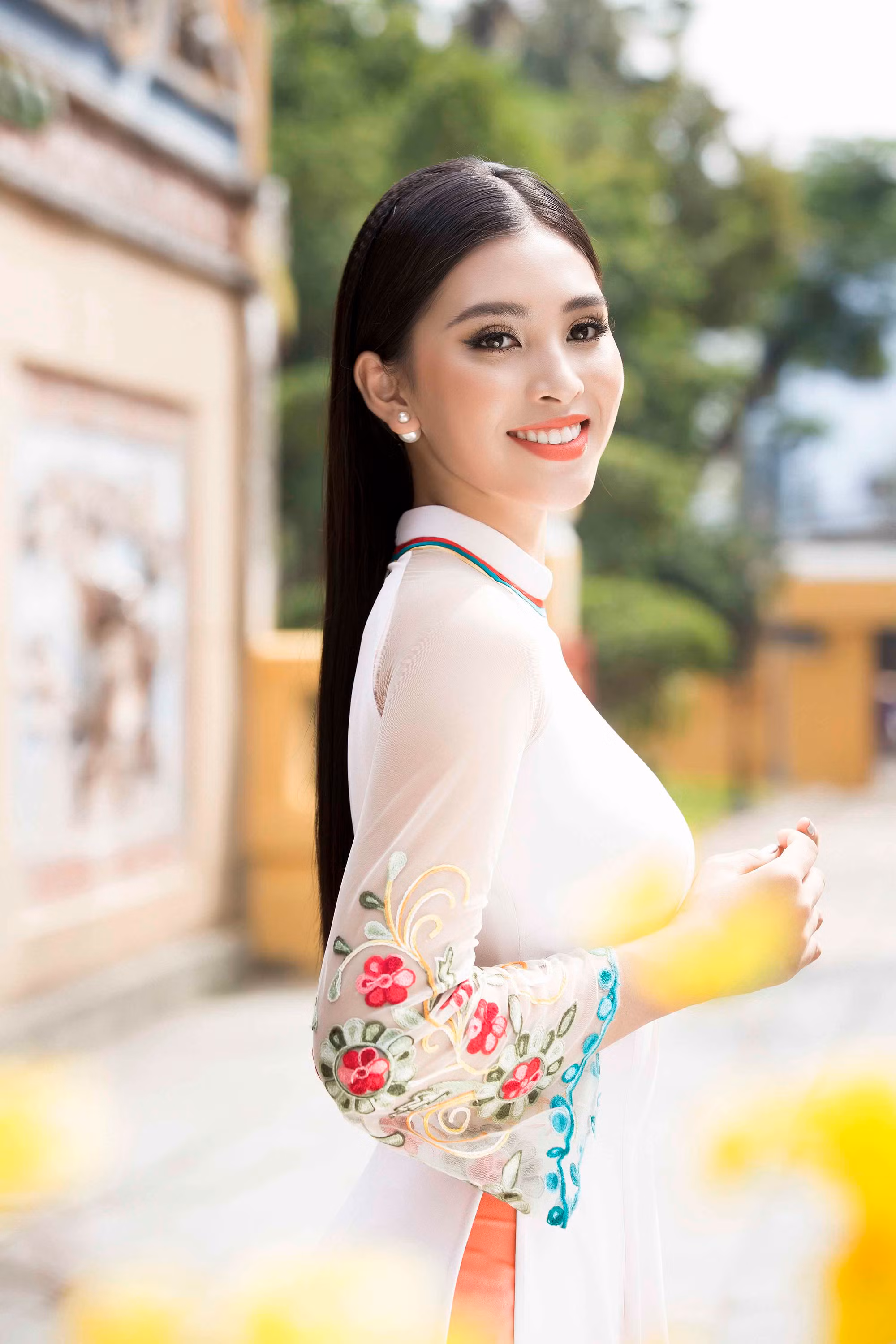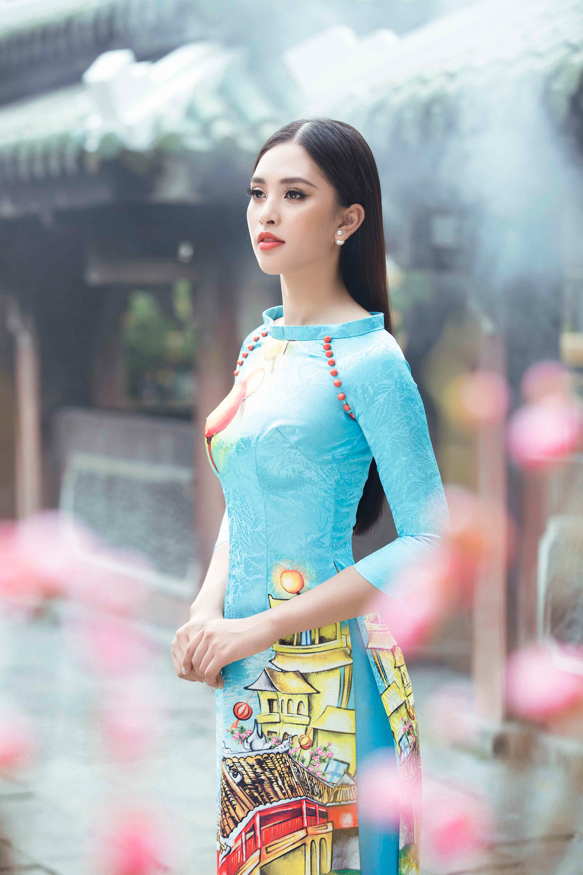 Nhan sắc quyến rũ, ngọt ngào tuổi 18 của Hoa hậu Việt Nam 2018 Tiểu Vy tỏa sáng rạng rỡ trong trang phục áo dài truyền thống của nhà thiết kế Ngô Nhật Huy.