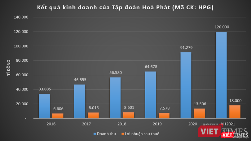 Năm 2020, Hòa Phát ghi nhận doanh thu thuần đạt 90.118 tỉ đồng, tăng 41,5% so với năm 2019; lợi nhuận sau thuế ở mức 13.506 tỉ đồng, tăng 78%.