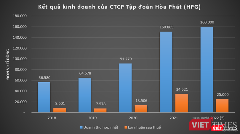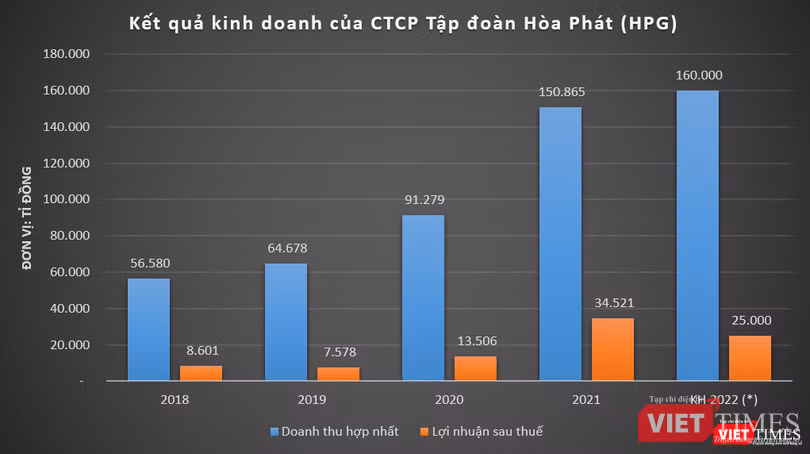 Theo đó, năm 2022, Hòa Phát đặt mục tiêu doanh thu 160.000 tỉ đồng, tăng 6% so với năm trước. Kế hoạch lợi nhuận sau thuế trong khoảng từ 25.000 – 30.000 tỉ đồng, giảm 13-28% so với thực hiện năm 2021.