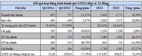 Trong riêng quý 4/2014, cả doanh thu và lợi nhuận của Hoàng Anh Gia Lai đều sụt giảm đáng kể so với cùng kỳ.