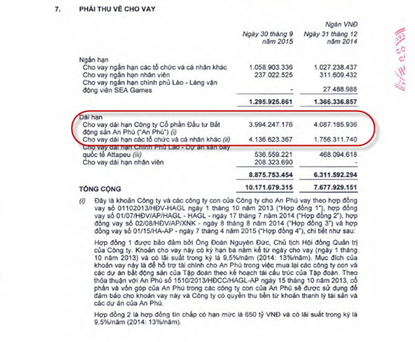 Thứ nhất, HAG và các công ty con đang cho Công ty cổ phần đầu tư Bất động sản An Phú (“An Phú”) vay với tổng số tiền là 3.994 tỷ đồng với 04 hợp đồng cho vay. Trong thuyết minh BCTC ghi rõ “Hợp đồng 1” được đảm bảo bởi Ông Đoàn Nguyên Đức, chủ tịch Hội đồng Quản trị của Công ty, khoản vay này có thời hạn ba năm kể từ ngày cho vay (ngày 1/10/2013) và có lãi suất trong kỳ là 9,5%/năm (2014: 13%/năm).
