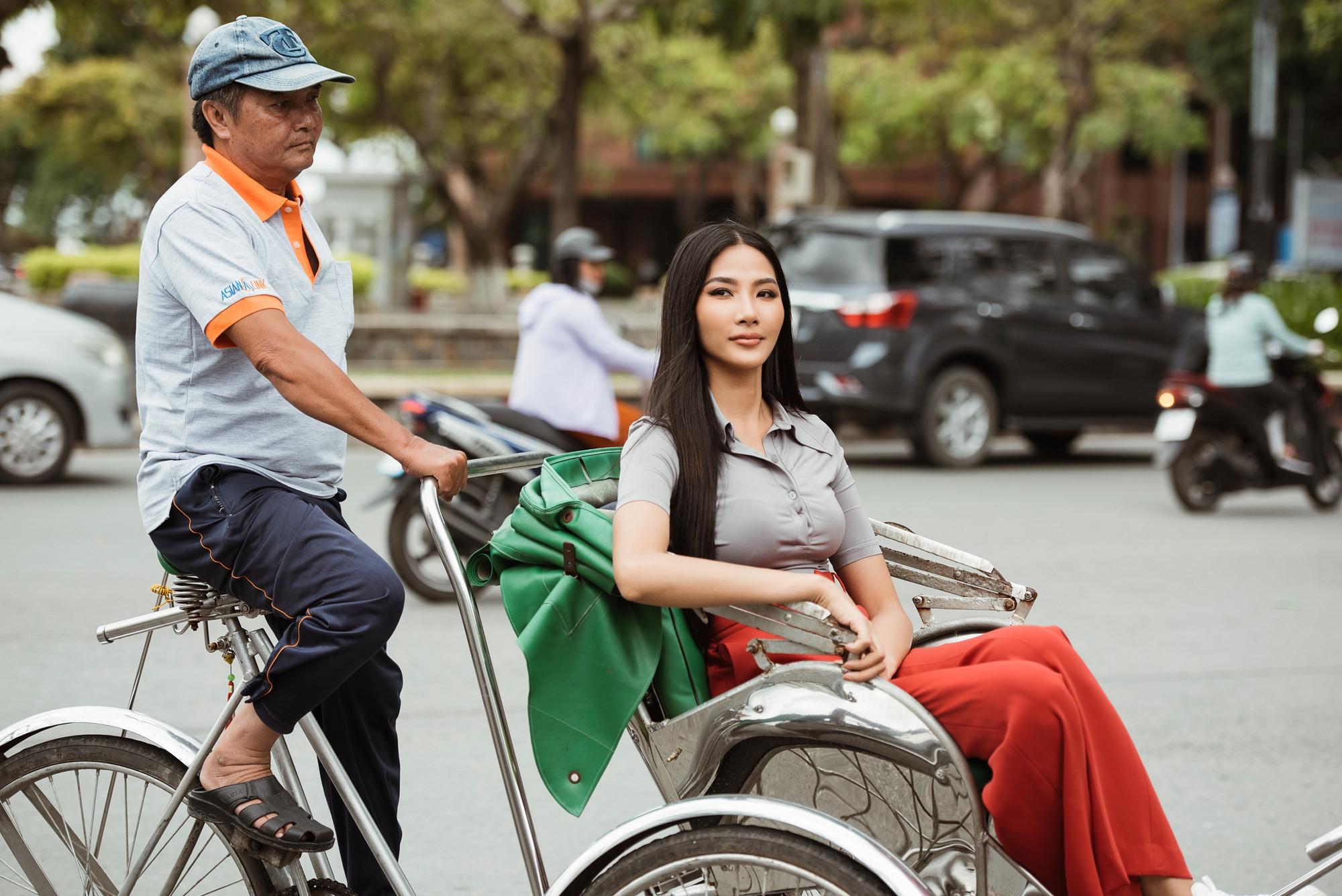 Tiếp theo đó, Hoàng Thùy đã cùng Santos Anjo trải nghiệm xích lô - một điểm đặc trưng của Sài Gòn. Hoàng Thùy chia sẻ rằng: “Đây là lần đầu tiên Thùy đi xích lô và cảm giác rất là thú vị”. Cô còn hài hước đùa với chú đạp xích lô “Con không nặng đúng không chú? Con nhẹ lắm ạ”.