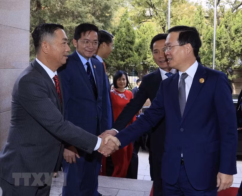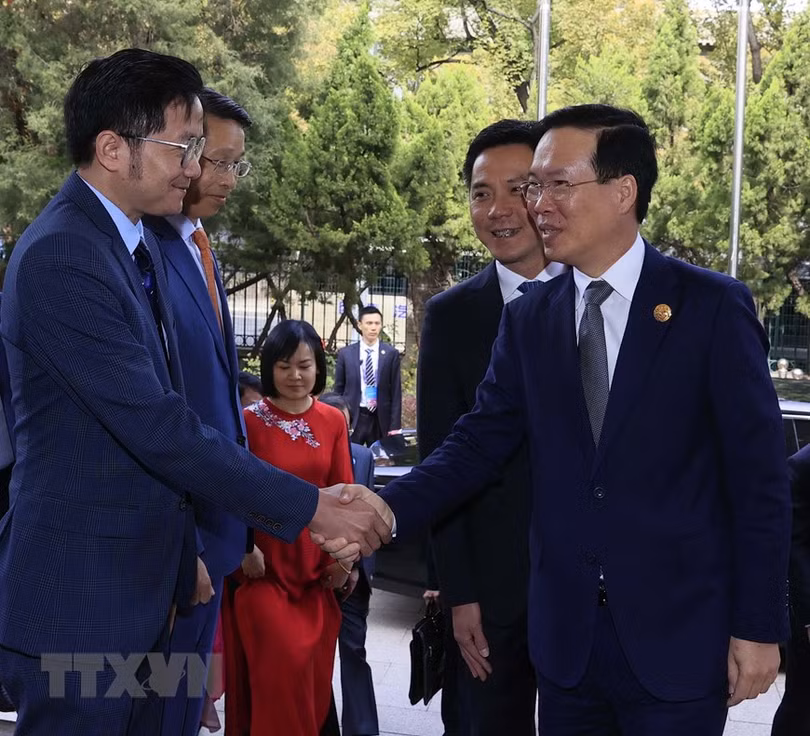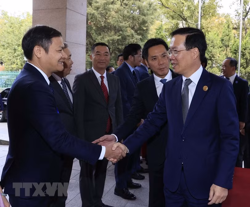 Chủ tịch nước Võ Văn Thưởng với cán bộ, nhân viên Đại sứ quán Việt Nam tại Bắc Kinh và các Tổng Lãnh sự Việt Nam tại các thành phố lớn ở Trung Quốc. (Ảnh: Thống Nhất/TTXVN)