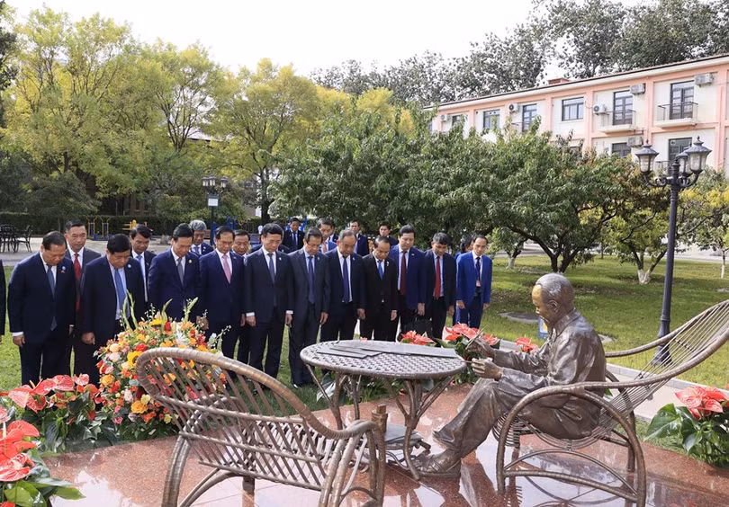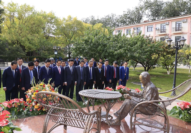 Chủ tịch nước Võ Văn Thưởng và các thành viên Đoàn đại biểu cấp cao Việt Nam đặt hoa tưởng nhớ Chủ tịch Hồ Chí Minh trong khuôn viên Đại sứ quán Việt Nam tại Bắc Kinh, Trung Quốc. (Ảnh: Thống Nhất/TTXVN)